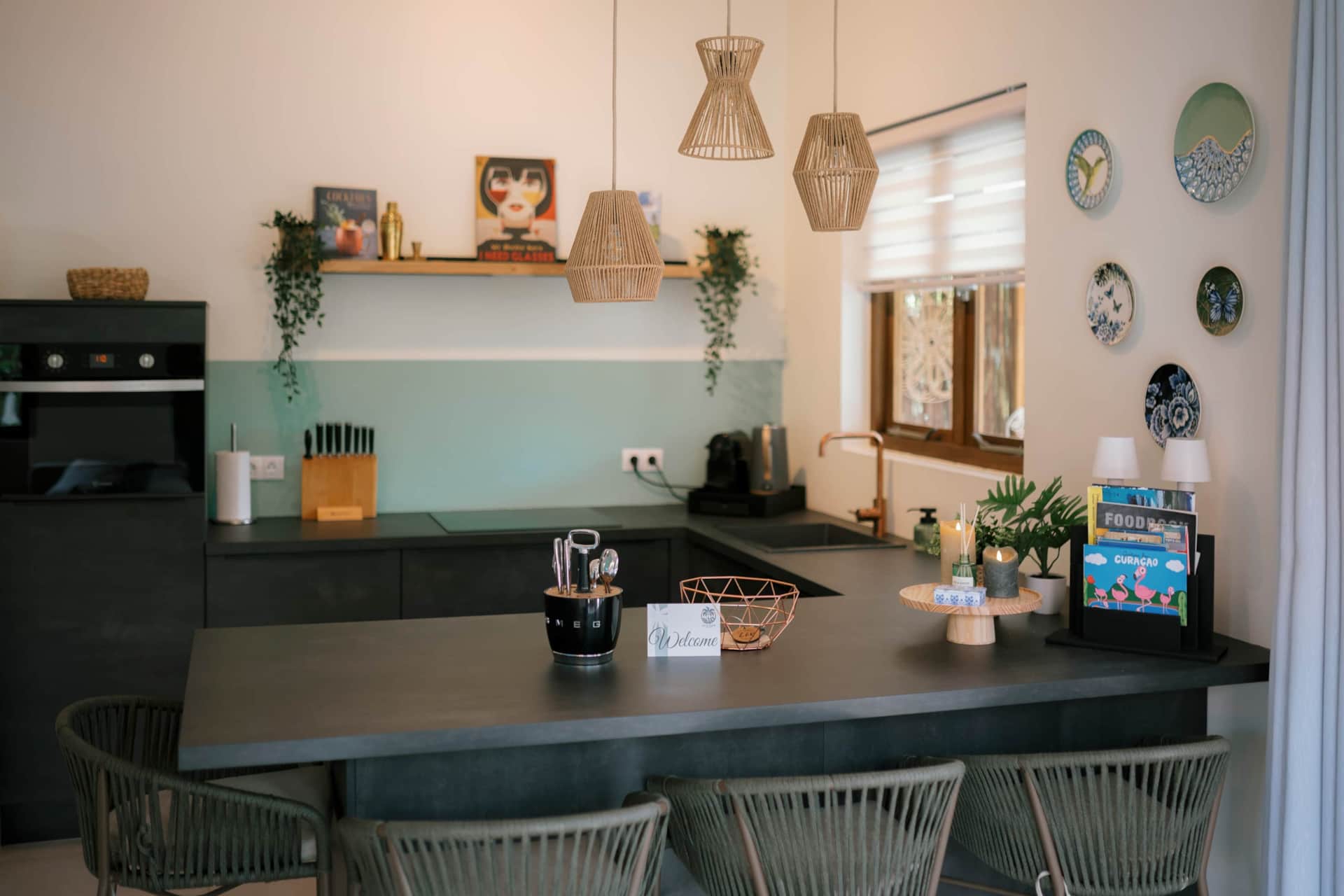 De moderne Europese keuken is ruim opgezet met grote ontbijtbar, genoeg werkblad en voorzien van diverse inbouwapparatuur waaronder een inductiekookplaat, combi- magnetron, koel/vriescombinatie en een vaatwasser. Voor koffie en thee is de koffie/theebar met Nespresso apparaat en waterkoker. De keuken is volledig uitgerust met een uitgebreid servies, degelijk bestek en alle nodige keukengerei om comfortabel en stijlvol te kunnen koken en dineren.